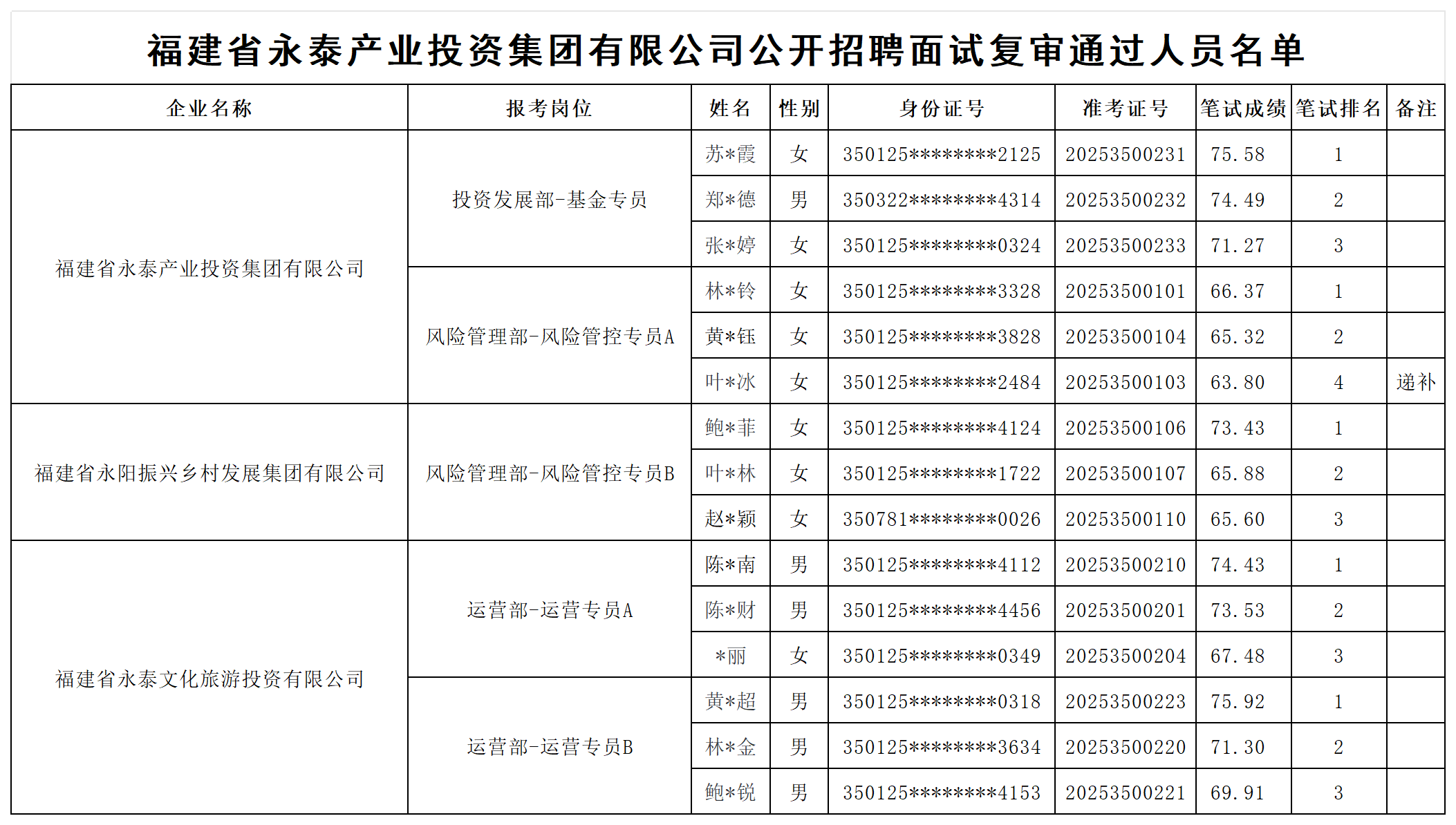 面试结束后,按综合成绩从高到低1:1确定体检、考察人选,相关事宜将通过永泰县政府信息网、公司微信公众号、大美永泰微信公众号发布,请考生保持通讯畅通。