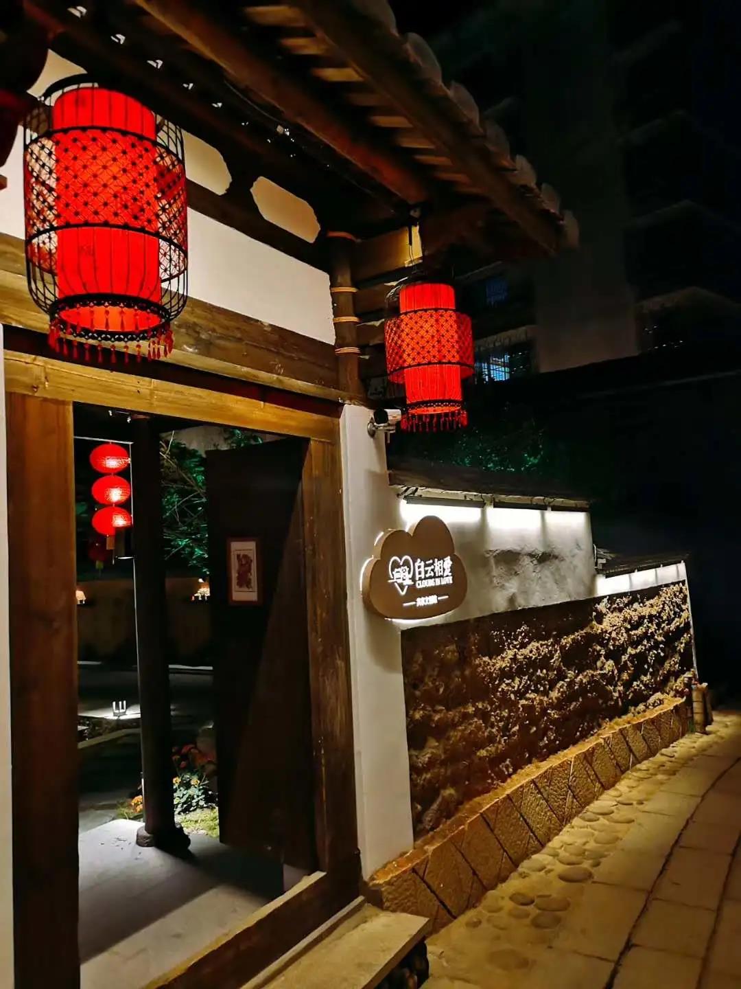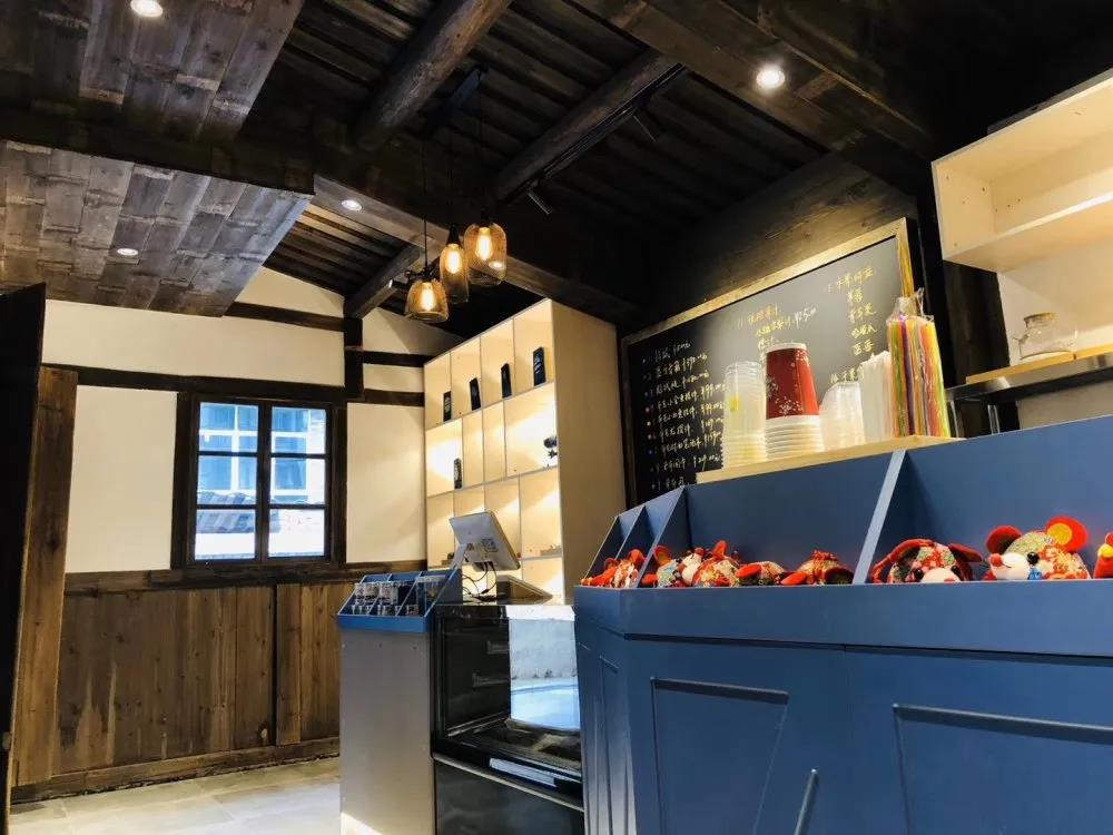 木质的桌椅摆放整齐,供游客休憩品茗,暖黄色的灯光洒满室内,温馨恬淡。