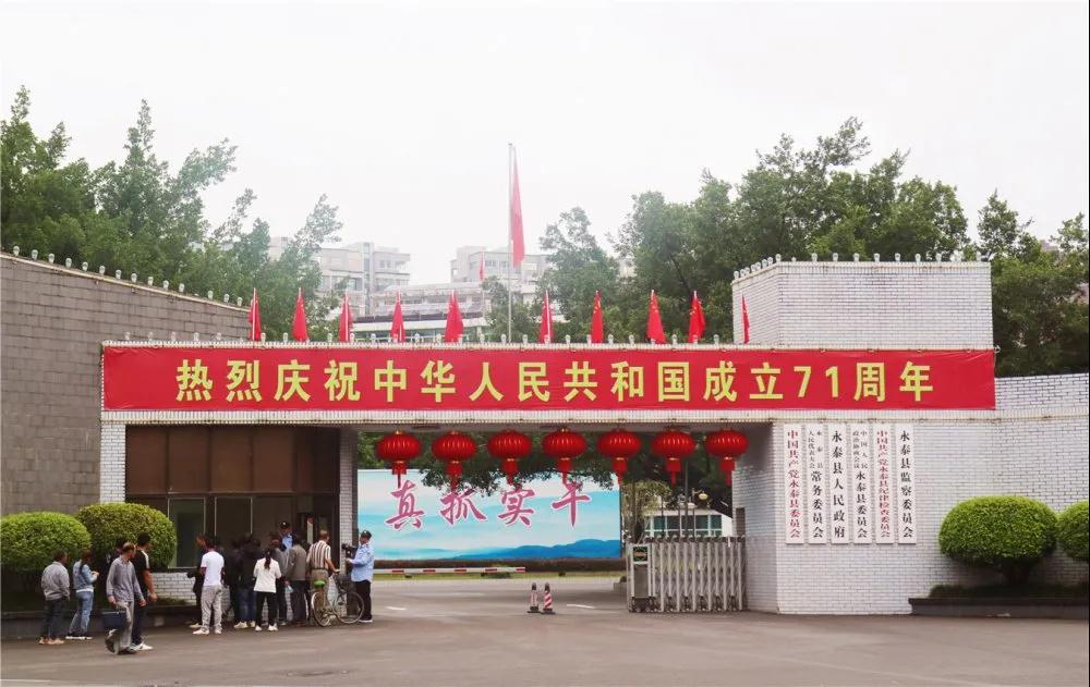 在县政府门口“热烈庆祝中华人民共和国成立71周年”的横幅高高挂起,大红的灯笼附和着飘扬的红旗,用最美“中国红”向祖国献礼。