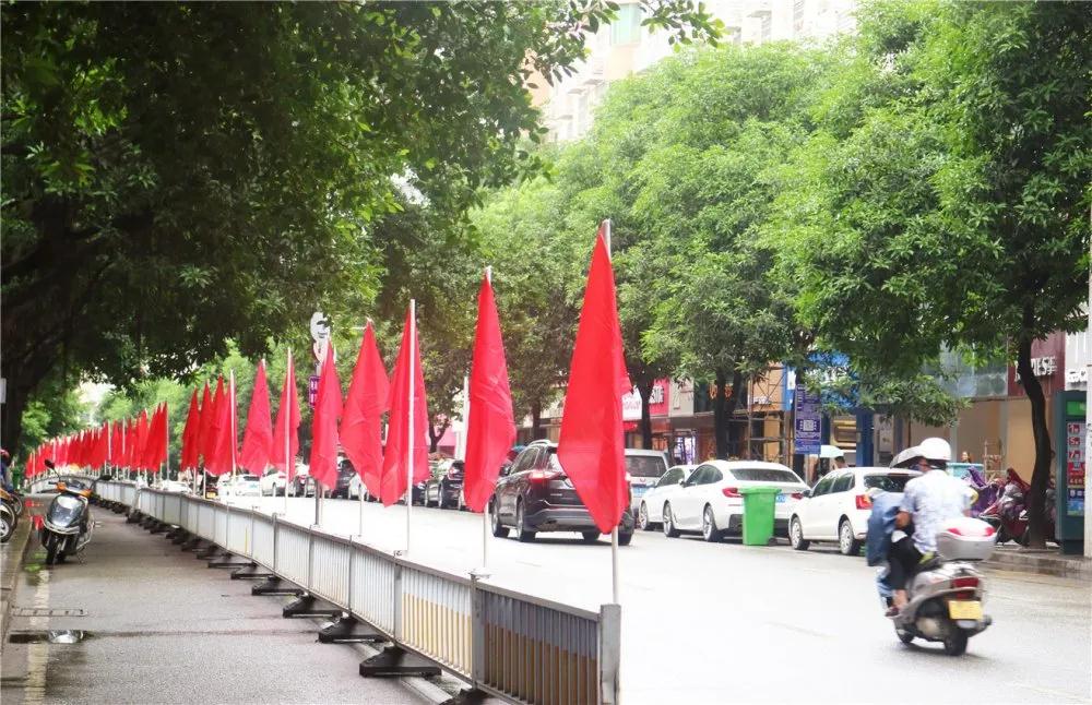 在城区主干道上,悬挂在道路两侧的红旗整齐划一,装点在每一个视线可及之处。那一抹鲜艳的红随着街道、桥梁一路延伸,把县城映衬得朝气蓬勃、分外红火。