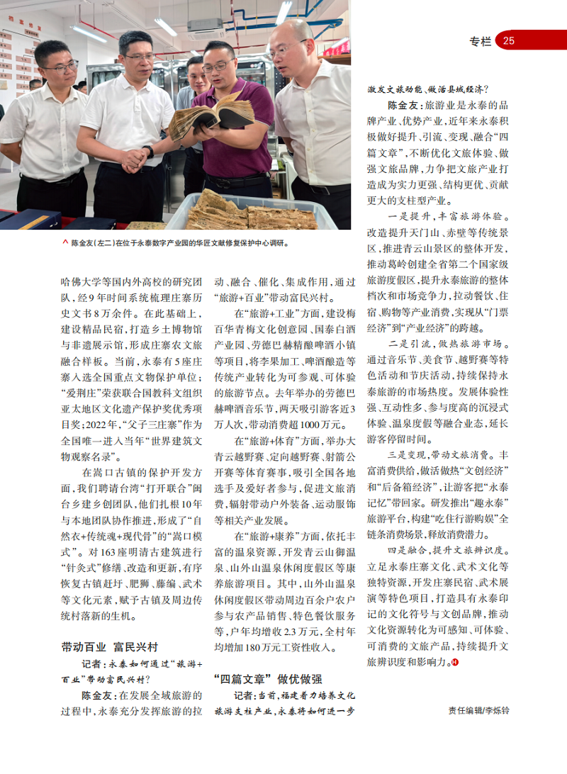 陈金友:旅游业是永泰的品牌产业、优势产业,近年来永泰积极做好提升、引流、变现、融合“四篇文章”,不断优化文旅体验、做强文旅品牌,力争把文旅产业打造成为实力更强、结构更优、贡献更大的支柱型产业。