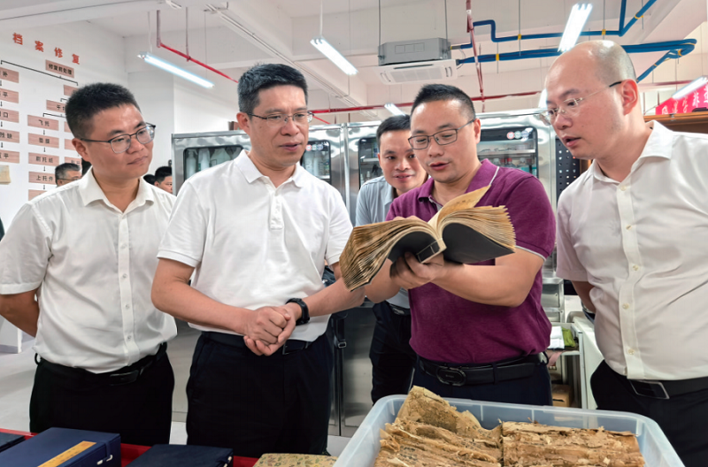 陈金友(左二)在位于永泰数字产业园的华匠文献修复保护中心调研。