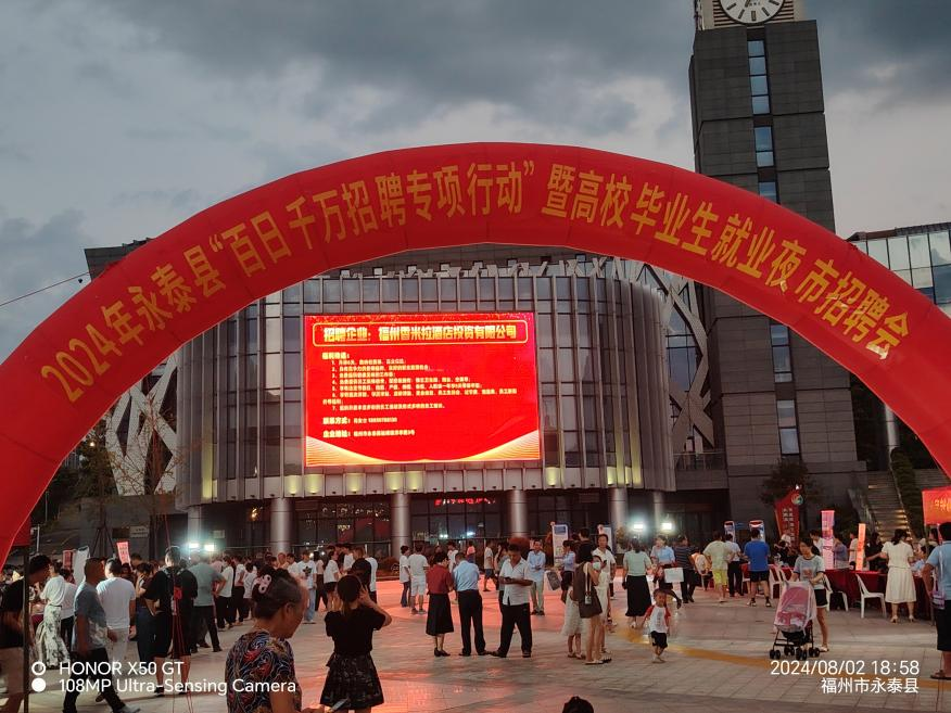为切实做好高校毕业生等重点群体就业工作,2024年8月2日晚,永泰县人社局在永阳文化中心广场成功举办2024年永泰县“百日千万招聘专项行动”暨高校毕业生就业夜市招聘会。